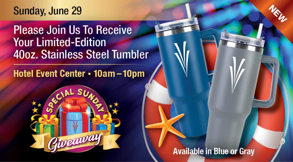 ¡Para agradecerte tu lealtad, te invitamos a unirte a nosotros el domingo 29 de junio para recoger tu regalo especial del Domingo! Únete a nosotros en el Hotel Event Center todo el día y la noche para recibir tu Vaso de Acero Inoxidable de 40 oz. de edición limitada, cortesía del Valley View Casino & Hotel.