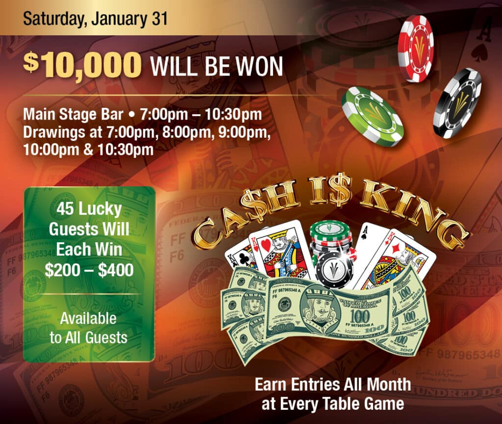 Earn your entries all month long through table game play by using your Players Club card, and every Tuesday and Wednesday, earn double the entries by taking advantage of Cash Is King Double Entries. Then, join us on Saturday, January 31 at the Main Stage Bar for this month’s event.