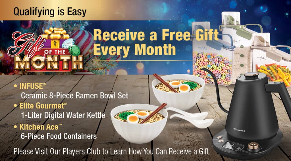 Please see any of our friendly Players Club team members to learn how you can qualify to receive your Gift of the Month.