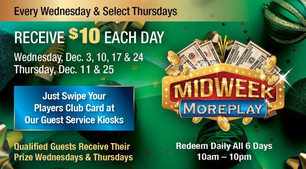 Qualified members will simply swipe their Players Club card at our guest service kiosks to receive $10 instantly every Wednesday and select Thursdays. Please visit our Players Club to learn more.