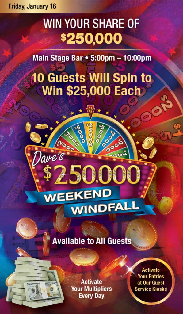 Please join us for Dave’s $250,000 Weekend Windfall happening on Friday, January 16. Every hour from 5pm–9pm, 10 winners will spin to win $200–$1,000 each in MOREPLAY®. Then, at 10pm, 10 additional lucky winners will spin to win $25,000 each. Be at our Main Stage Bar to win big!