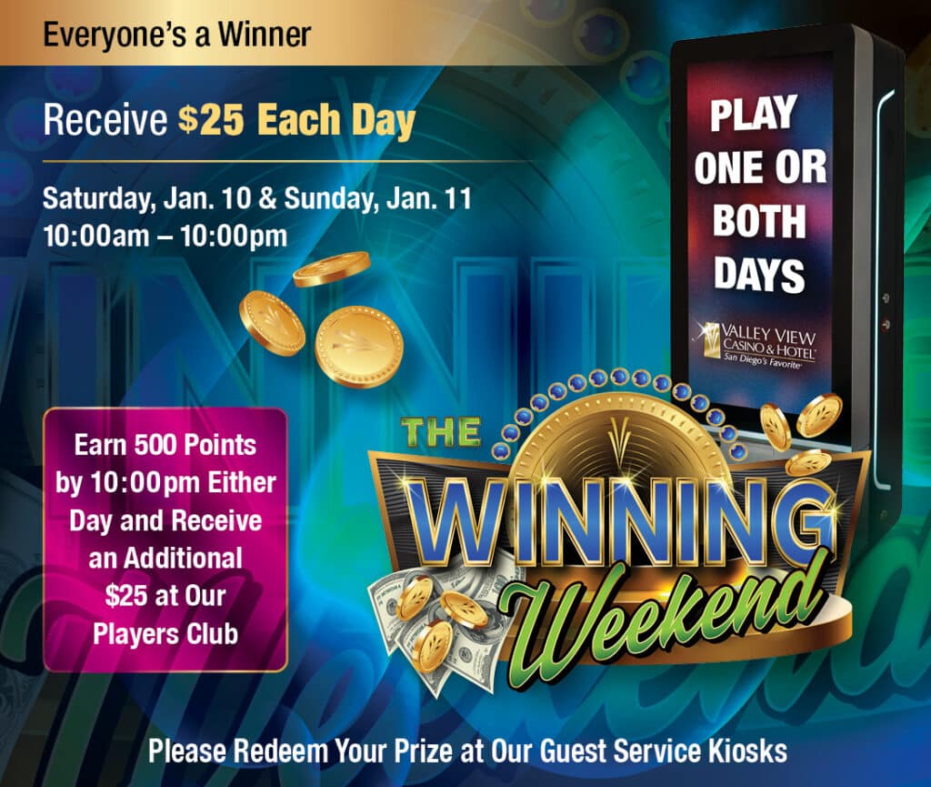 Invited guests will swipe their Players Club card at any of our guest service kiosks to receive $25 instantly during our Winning Weekend event happening on Saturday, January 10 and Sunday, January 11. Every invited guest can swipe one or both days. Visit our Players Club to learn how you can receive an invitation.